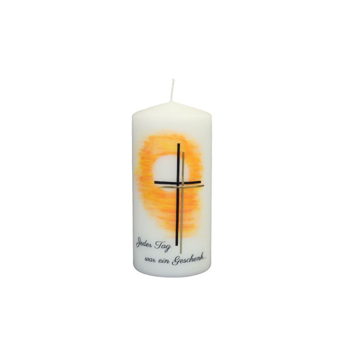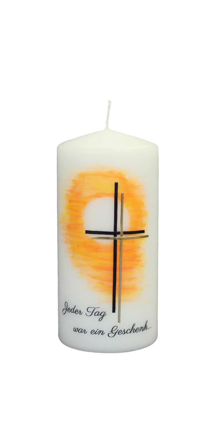 Trauerkerze KUNIGUNDA, Jeder Tag war ein Geschenk, verziert, elfenbein-gelb-schwarz, 15cm, Ø6,8cm - Made in Germany
