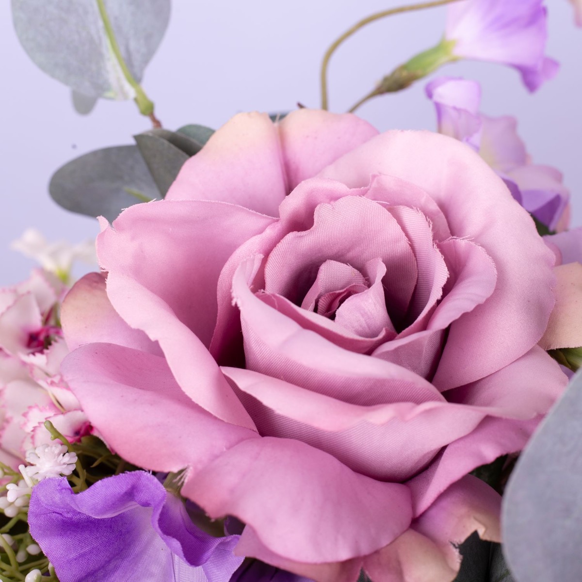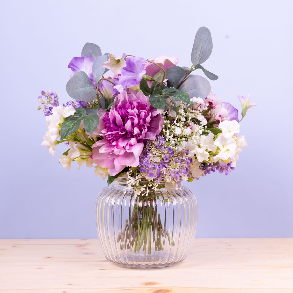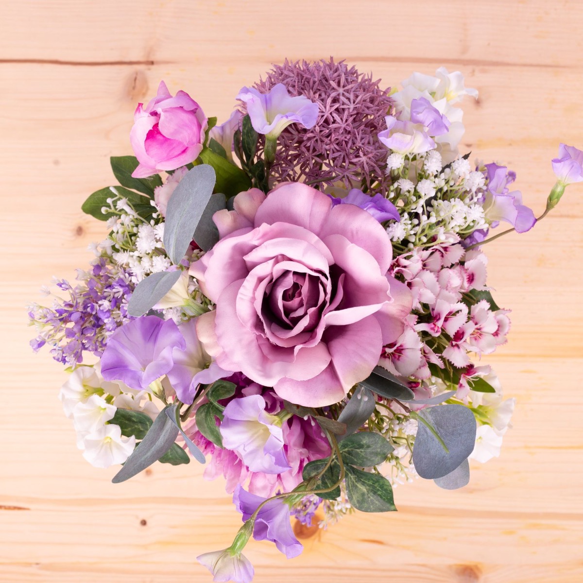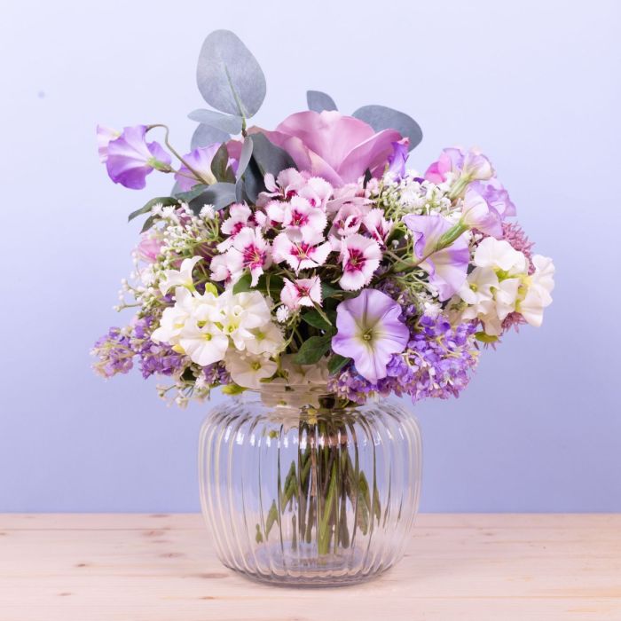 Zarte Farben und liebliche Blumen! Dieser kleine Strauß ist einfach süß und immer ein passendes Mitbringsel für eine liebe Person. Rose, Bartnelke, Pfingstrose, Allium, Trichterwinde, Eukalyptuszweige, weißer Phlox, zartes Schleierkraut und zartlilafarbener Flieder wurden zu einem Ministrauß gebunden, der perfekt in die kleine Bauchige Vase passt. Dieser kleine Strauß ist auch eine perfekte Tischdeko für Hochzeiten oder andere Festlichkeiten, denn er versperrt nicht die Sicht auf seinem Gegenüber. Shop the Look!