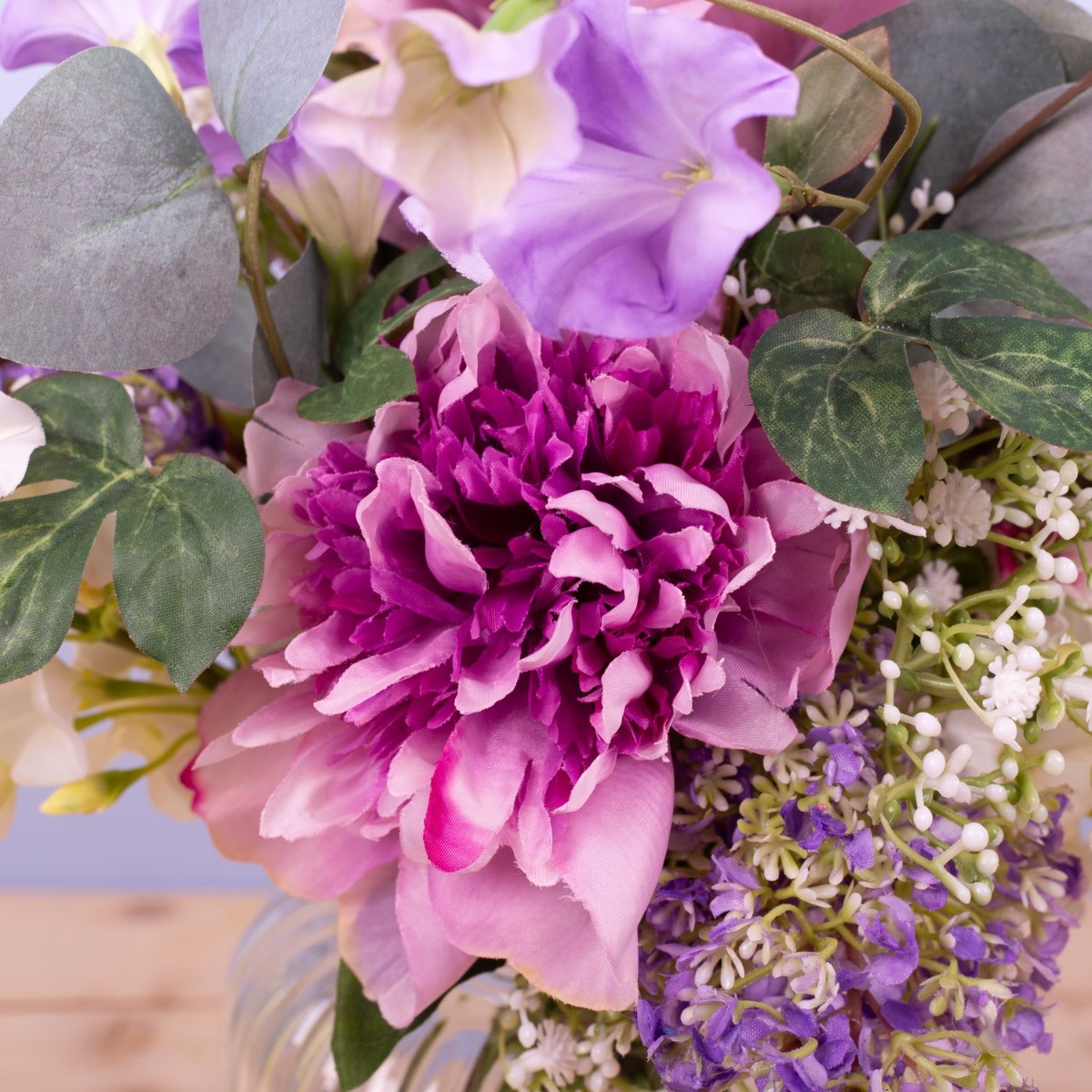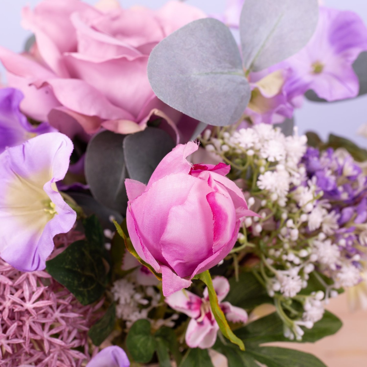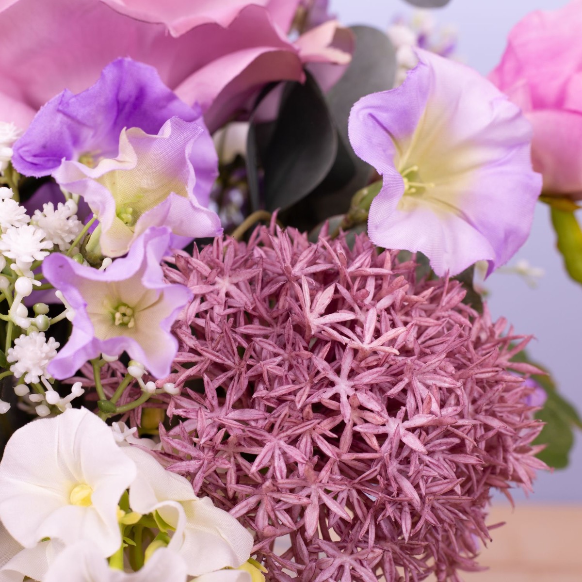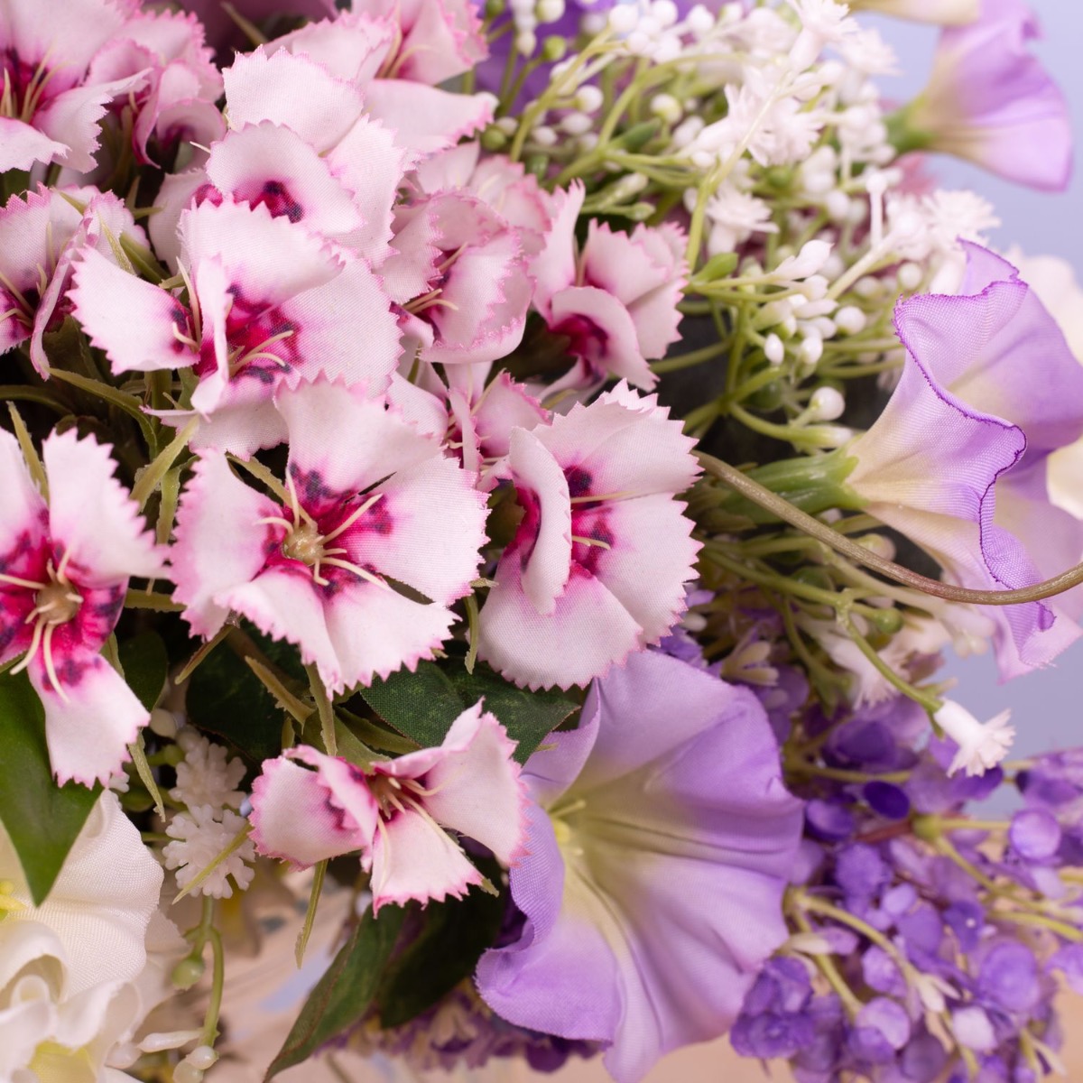 Zarte Farben und liebliche Blumen! Dieser kleine Strauß ist einfach süß und immer ein passendes Mitbringsel für eine liebe Person. Rose, Bartnelke, Pfingstrose, Allium, Trichterwinde, Eukalyptuszweige, weißer Phlox, zartes Schleierkraut und zartlilafarbener Flieder wurden zu einem Ministrauß gebunden, der perfekt in die kleine Bauchige Vase passt. Dieser kleine Strauß ist auch eine perfekte Tischdeko für Hochzeiten oder andere Festlichkeiten, denn er versperrt nicht die Sicht auf seinem Gegenüber. Shop the Look!