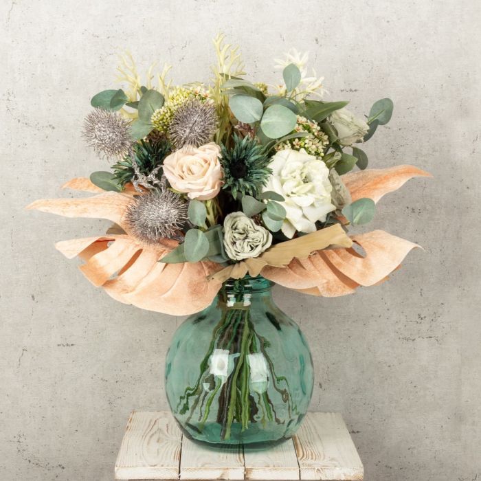 Rosé und Eukalyptusgrün! Dieser verträumte Blumenstrauß ist ein echter Blickfang. Die zarten Rosen, die samtigen Chrysanthemen und die stachelige Rambutan werden von den samtigen Blättern umrahmt. Da kann man sich gar nicht satt sehen! Denn dieser Strauß wirkt von jeder Seite anders. Das liegt daran, dass wir so viele unterschiedliche Blumen verwendet haben. Eine Freude für jedes Auge! Shop the Look!