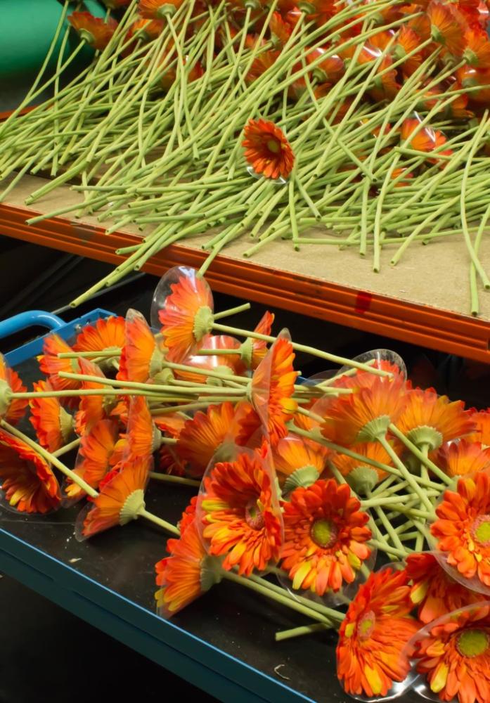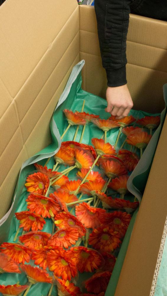 Nach ihrer kleinen, schmerzlosen Beauty- OP haben sich die Gerberas in den nächsten Warteraum begeben, wo sie von den sanften Händen unseres Packers dann vorsichtig in den Versandkarton begleitet und sicherheitsgemäß an den richtigen Platz geführt wurden. Nachdem sich Schritt für Schritt mehr Gerbera eingefunden haben und der Karton sich bis oben hin gefüllt hatte, war es an der Zeit die Luken zu schließen und die Kunstblumen auf die große Reise zu unserem Kunden zu schicken.