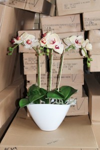 In Europa angekommen, muss natürlich erst der Zoll überprüfen, ob auch alles seine Richtigkeit hat. Irgendwann haben dann alle Kunstorchideen ihre Einreisegenehmigung. Diese wurden mit Stempeln, Stempeln und noch mehr Stempeln besiegelt: „Ware vom Zoll freigegeben“. Auf diese Worte haben wir gewartet! Nun kann die Reise nämlich weitergehen und Lahna wird jetzt in Europa mit Kunsterde und Topf vereint. Die von uns beauftragte Spedition kann dann feierlich aufladen und uns die nach unseren Wünschen designte künstliche Orchidee bis vor die Lagerhalle liefern. Diese Abläufe dauern natürlich mehrere Wochen.