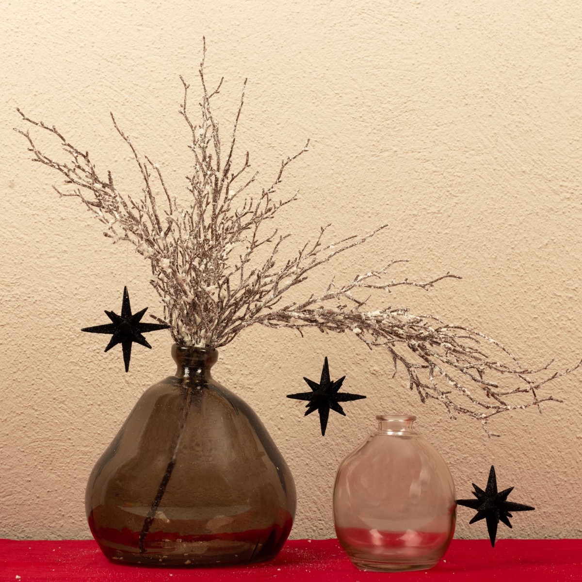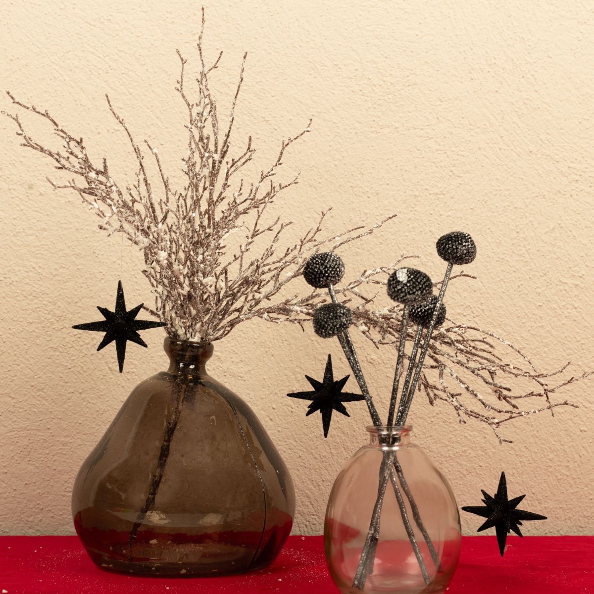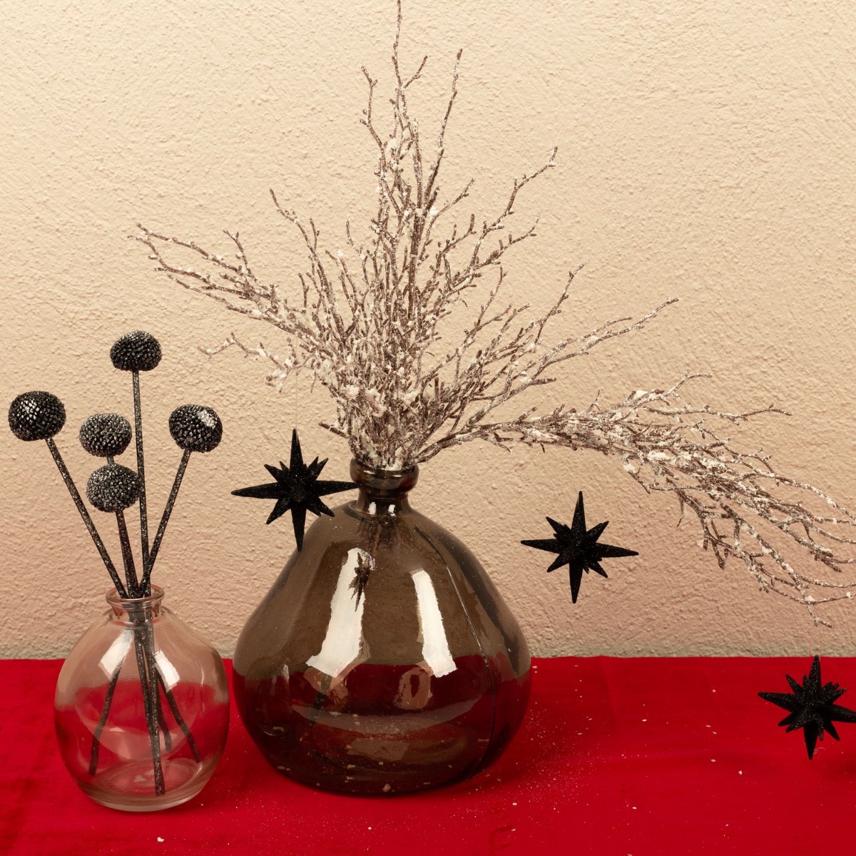 Silber und schwarz! Dieser elegante Look läutet die bevorstehende Weihnachtszeit ein. Für alle, die sich schon im Herbst auf Weihnachten freuen! Ein beschneiter, silbrig glänzender Weidenzweig steckt in einer bauchigen Flasche, die eine außergewöhnliche, ungleichmäßige Form hat. Das besondere Highlight sind unsere schwarzen, glitzernden Sternanhänger, die später auch an den Weihnachtsbaum gehängt werden können. Der Bund aus schwarzem Zierlauch unterstreicht das extravagante Design dieses Looks. Shop the Look!