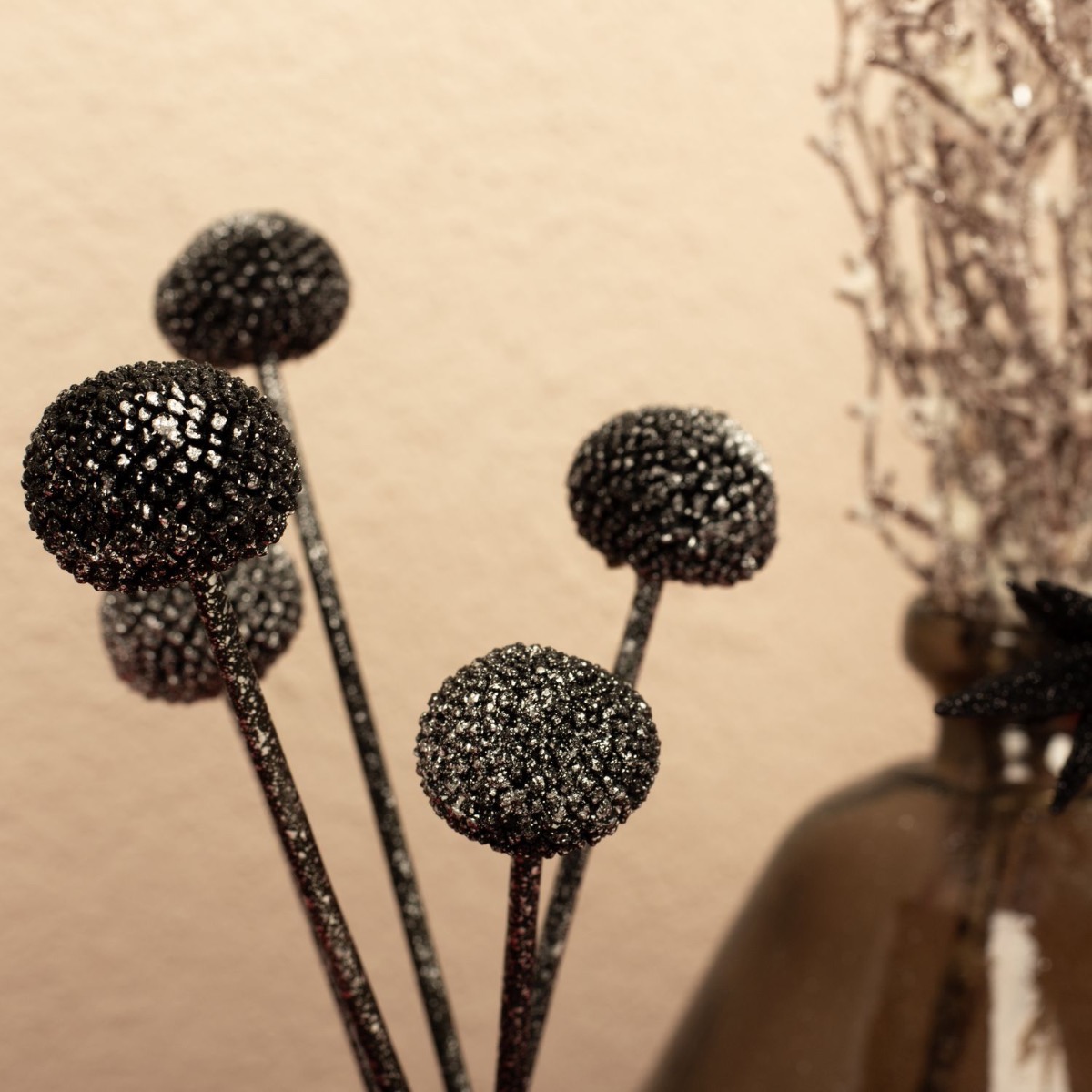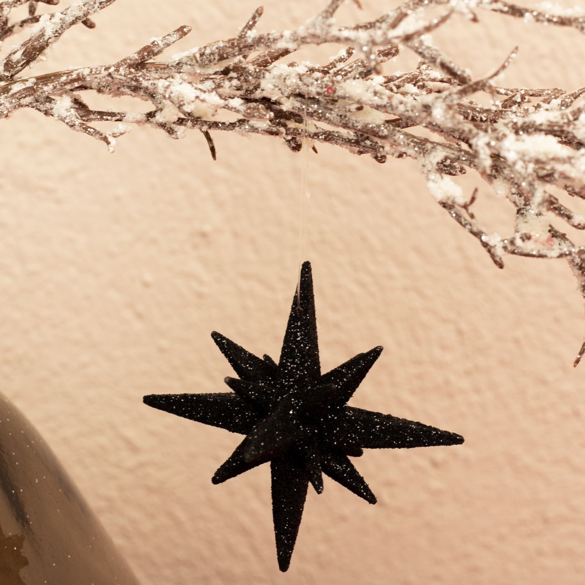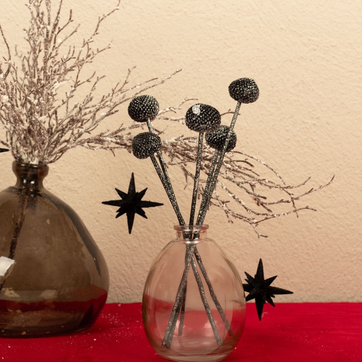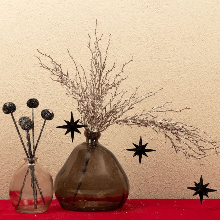 Silber und schwarz! Dieser elegante Look läutet die bevorstehende Weihnachtszeit ein. Für alle, die sich schon im Herbst auf Weihnachten freuen! Ein beschneiter, silbrig glänzender Weidenzweig steckt in einer bauchigen Flasche, die eine außergewöhnliche, ungleichmäßige Form hat. Das besondere Highlight sind unsere schwarzen, glitzernden Sternanhänger, die später auch an den Weihnachtsbaum gehängt werden können. Der Bund aus schwarzem Zierlauch unterstreicht das extravagante Design dieses Looks. Shop the Look!