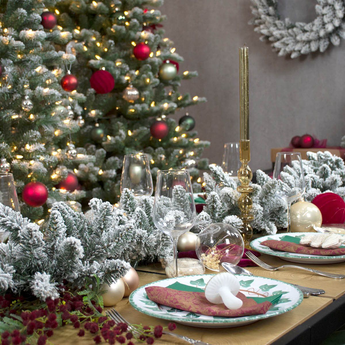 Gestaltungstipp: Setzen Sie auf Kontraste: Schmücken Sie den großen, beschneiten Tannenbaum mit glänzenden roten und silbernen Kugeln und gestalten Sie den Esstisch passend dazu mit einer Tannengirlande, roten Beerenzweigen und Weihnachtskugeln – so entsteht Tiefe und festliche Stimmung. Ergänzen Sie das Ensemble z.B. mit Kerzen oder warmweißen Lichterketten für ein harmonisches Gesamtbild und eine einladend stilvolle Weihnachtsatmosphäre.