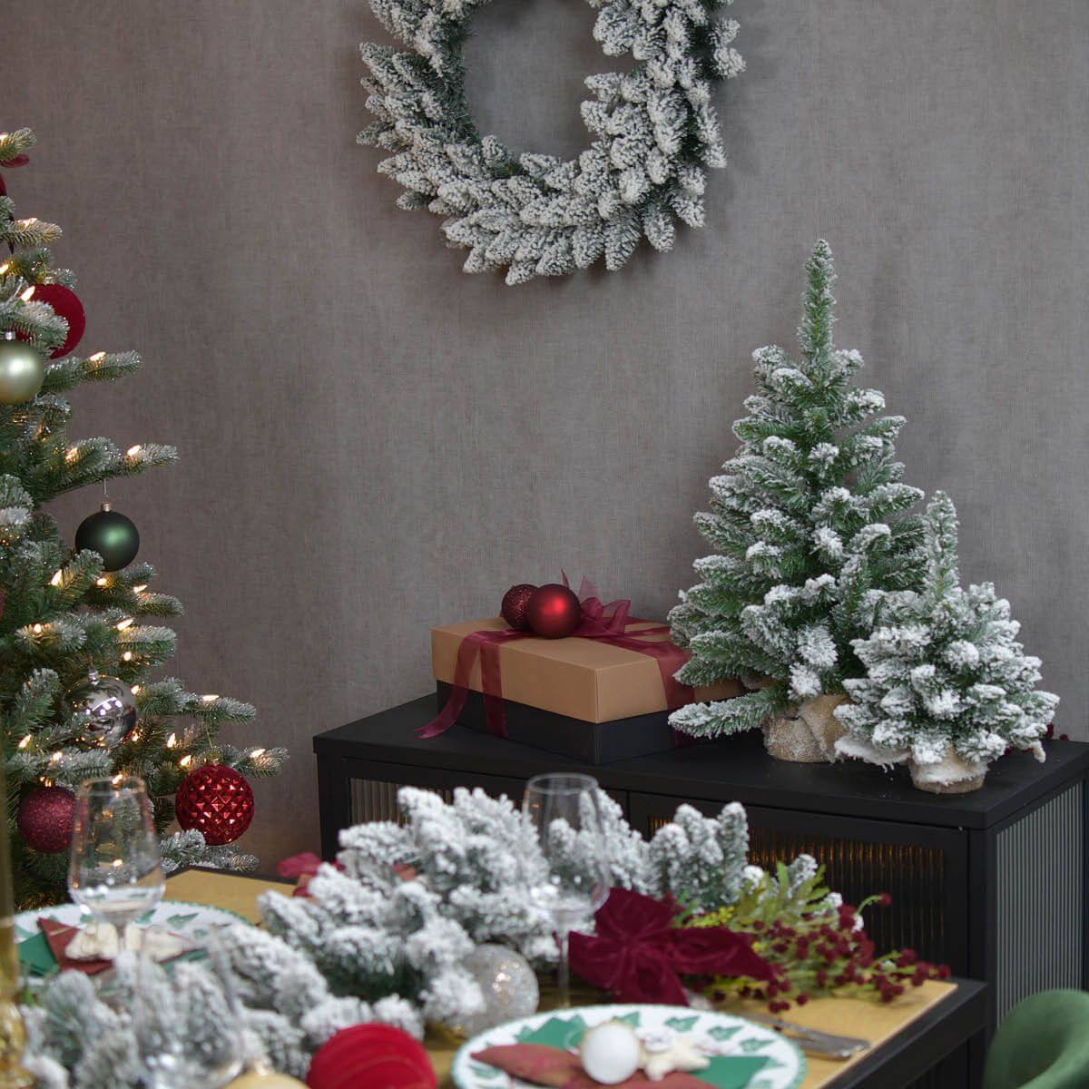 Wo festliche Eleganz auf gemütliche Winterstimmung trifft! Tauchen Sie ein in die zauberhafte Welt festlicher Eleganz! Dieser Wohnraum versprüht pure Weihnachtsmagie: Ein imposanter, beschneiter Tannenbaum erstrahlt in glänzenden roten und silbernen Kugeln, während im Hintergrund ein kunstvoll beschneiter Tannenkranz für harmonische Festlichkeit sorgt. Zwei kleine, ungeschmückte Schneetannen auf dem Sideboard verleihen dem Raum natürlichen Charme. Im Vordergrund setzt der festlich gedeckte Esstisch glanzvolle Akzente: Eine beschneite Tannengirlande, geschmückt mit leuchtenden roten Beerenzweigen und funkelnden Weihnachtskugeln, lädt Familie und Freunde zu unvergesslichen Festmomenten ein. Perfekt für alle, die Weihnachten stilvoll, warm und einladend feiern möchten – ein Raum, der das Herz erwärmt und zum Verweilen einlädt! Shop the Look!