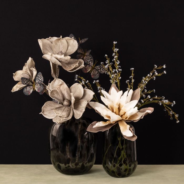 Romantik und Melancholie! Diese winterliche Stimmung wird in unserem ausgefallenen Look mit Kunstblumen erzeugt, die aussehen, als wären sie aus einer Traumwelt. Große Blüten, die sich weich anfühlen und mit warmen Grautönen eine melancholische Stimmung erzeugen. Schmetterlinge symbolisieren Träume und Wünsche, die in unseren Herzen flattern und an die warme Jahreszeit erinnern. Besonders trendy wird dieser Look mit den Vasen im Leo-Design, die in jedem Wohnraum ein Hingucker sind. Träumen auch Sie mit diesem schönen Arrangement aus Kunstblumen! Shop the Look!
