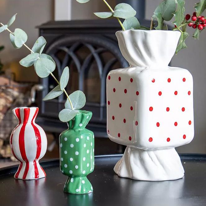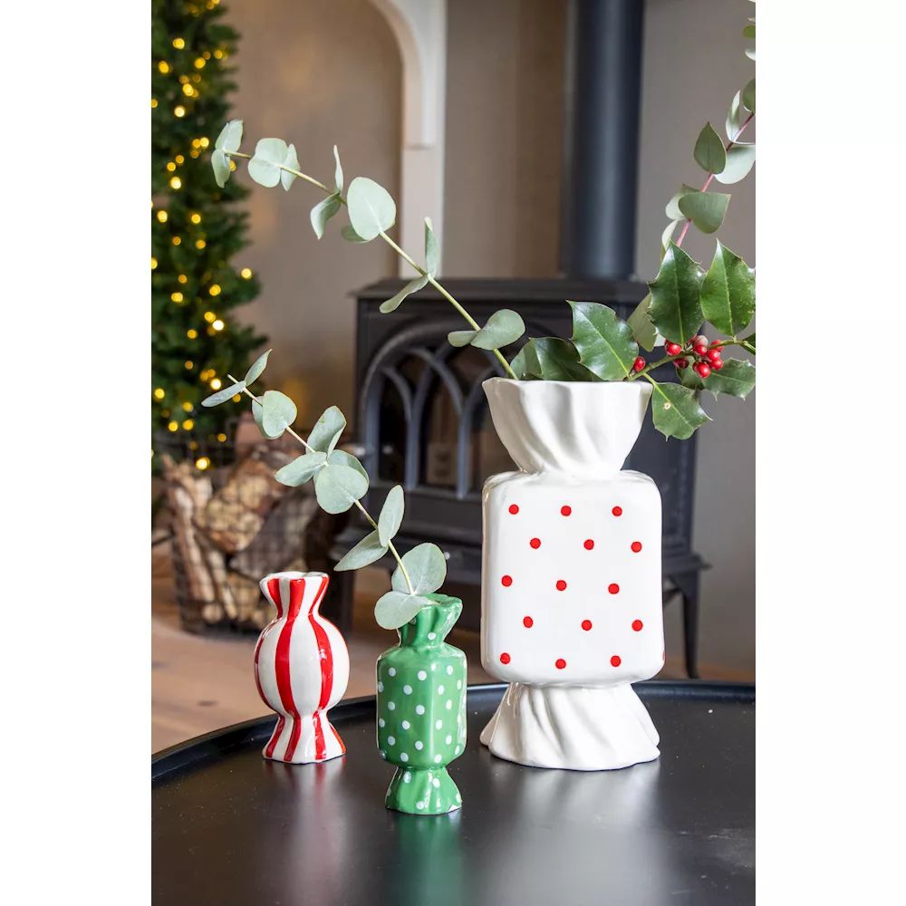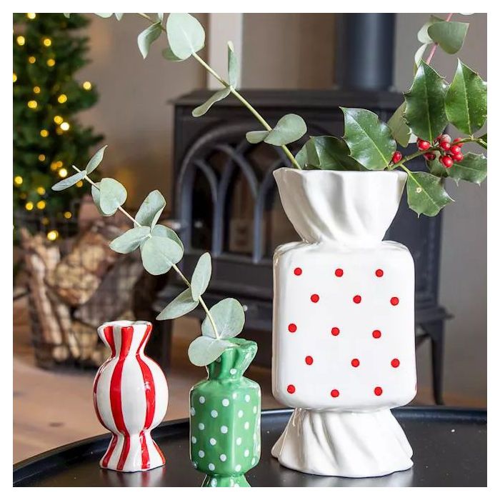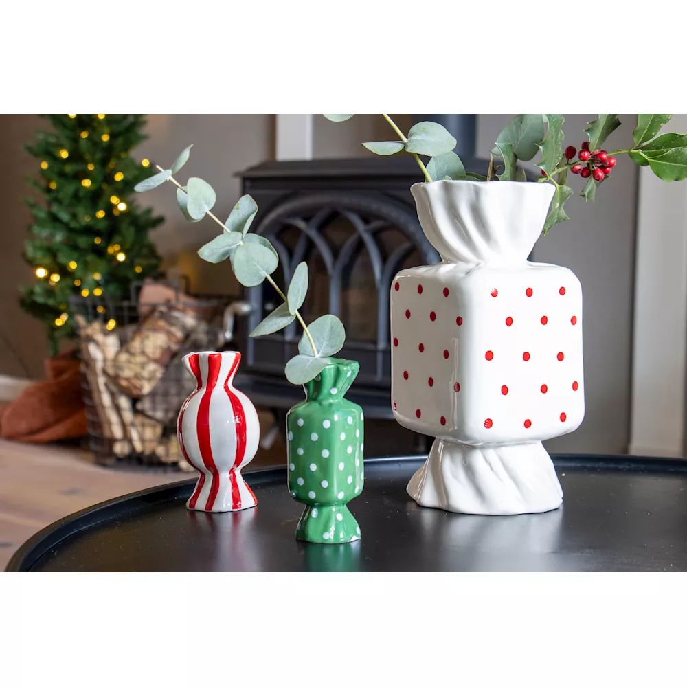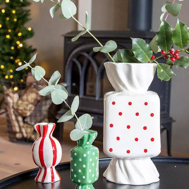 Farbige Akzente für festliche Momente! Kleine, verspielte Bonbon-Keramikvasen setzen farbenfrohe Akzente und strahlen Leichtigkeit aus. Minimalistisch bestückt mit Ilex- und Eukalyptuszweigen entstehen charmante, winterliche Arrangements, die ganz nebenbei Freude verbreiten. Im Hintergrund funkelt ein Weihnachtsbaum mit Lichterkette und taucht die Szene in warmes, magisches Licht. Ein stimmungsvolles Zusammenspiel aus Farbe, Natur und weihnachtlichem Zauber – perfekt, um winterliche Momente stilvoll zu genießen. Shop the Look!