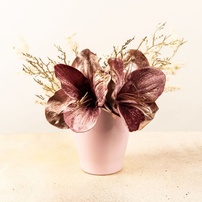 Rosé und Gold! Eine glamouröse Kombination, die besonders gut zur festlichen Jahreszeit passt. Der rosefarbene Orchideentopf passt farblich super zu der samtigen Amarillys. die für Zuneigung und Freundschaft steht. Goldene und weiß beschneite Zweige sorgen für noch mehr Glanz in diesem Look und lassen die Blume richtig schön zur Geltung kommen. Shop the Look!