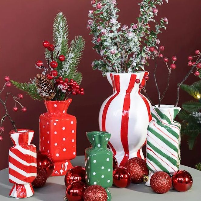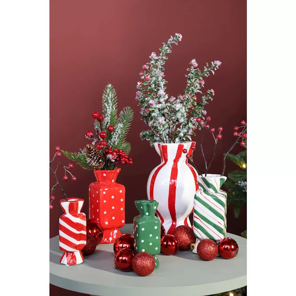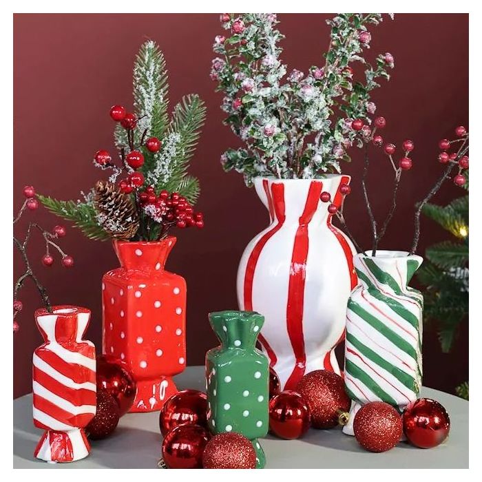 Süße Akzente im Winterzauber! Zwischen dezent funkelnden Weihnachtskugeln entsteht ein feines Glanzspiel, als läge ein sanfter Schimmer über dem Raum. Die Kugeln reflektieren das Licht und setzen klare, ruhige Akzente. Daneben stehen Vasen in bunter Bonbon-Form, glänzend wie frisch ausgepackte Süßigkeiten aus einem riesigen Zuckerglas. Die kräftigen, aber harmonischen Farbtöne bringen ein Gefühl von Wärme und Leichtigkeit in die winterliche Szenerie. Aus ihnen ragen beschneite Zweige, deren helle Spitzen einen angenehmen Kontrast setzen. Dazwischen leuchten rote Beeren auf, klar und präzise, wie kleine Farbpunkte, die das Arrangement zusammenhalten. So entsteht ein Look, der modern, farbig und dennoch winterlich klar wirkt. Ein Zusammenspiel aus zarten Frostmomenten und lebendigen Farben. Er verleiht dem Raum eine stille Festlichkeit, die einladend wirkt, ohne sich in den Vordergrund zu drängen. Shop the Look!