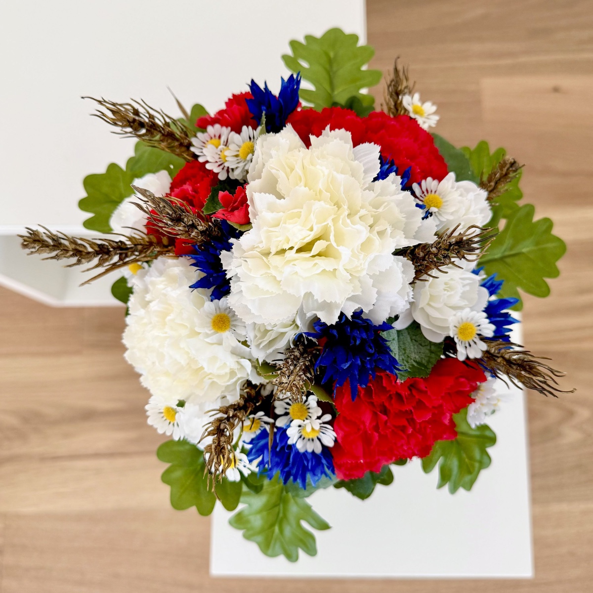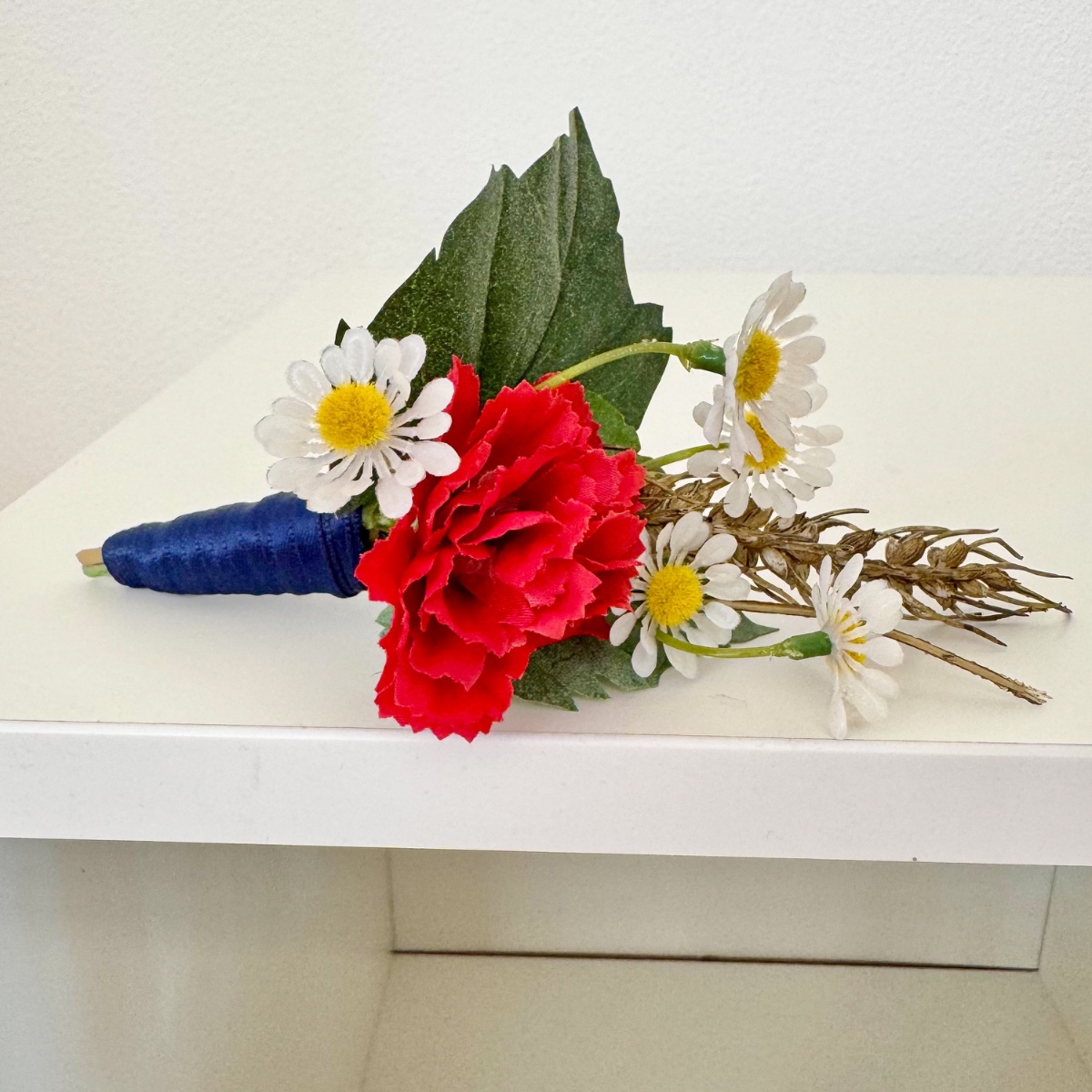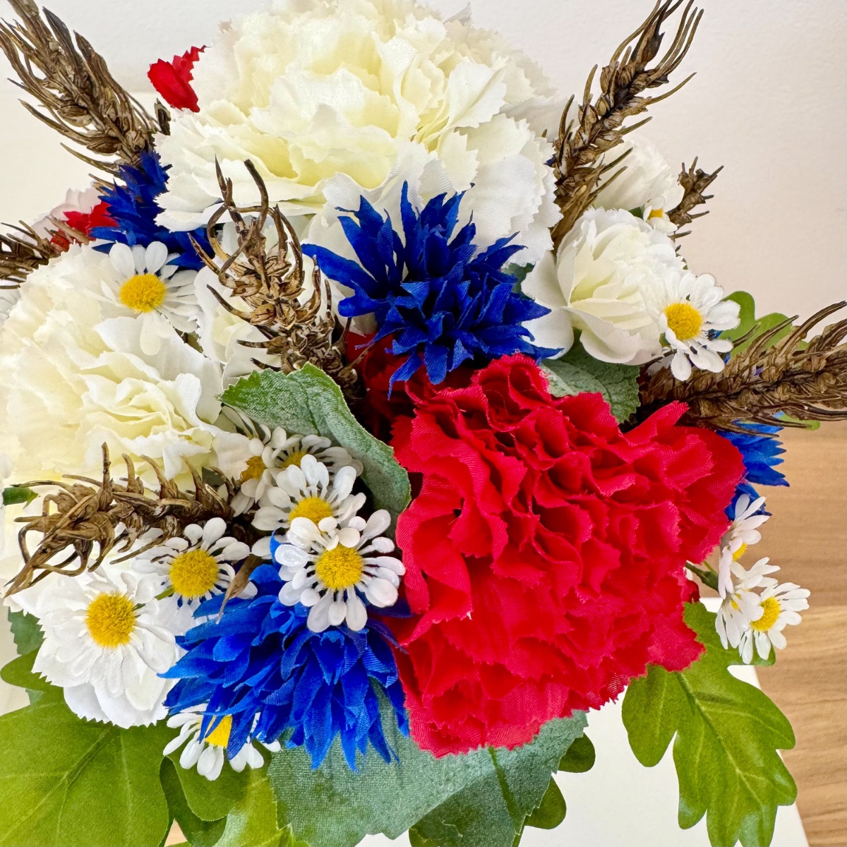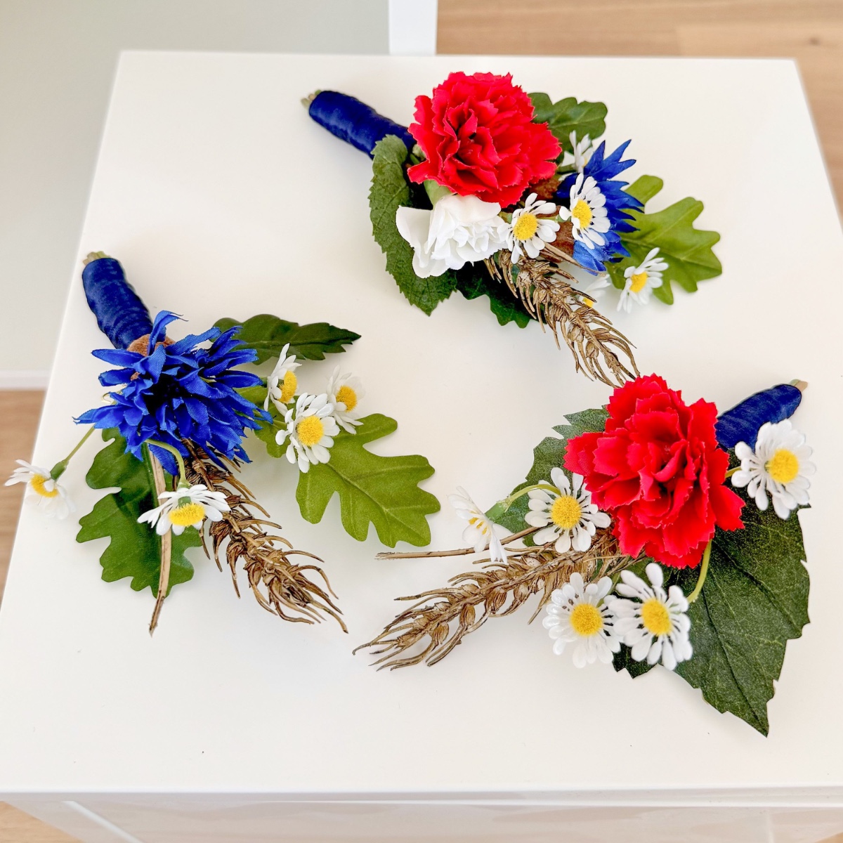 Ein Bund aus Liebe, Stärke und Heimat! Für ihre Hochzeit wünschte sich Tina einen Brautstrauß mit besonderer Symbolkraft. Im Mittelpunkt stehen ausdrucksstarke rote und weiße Nelken sowie blaue Kornblumen als Hauptblumen. Die roten Nelken symbolisieren leidenschaftliche Liebe und Hingabe, während die weißen Nelken für Reinheit, Treue und aufrichtige Verbundenheit stehen. Die Kornblume ergänzt das Arrangement mit ihrer Bedeutung von Natürlichkeit, Hoffnung und Beständigkeit. Zarte Kamille als Füllblume bringt eine sanfte Leichtigkeit in den Strauß und steht traditionell für Ruhe, Bescheidenheit und innere Stärke. Goldene Weizenähren verleihen dem Bouquet nicht nur eine warme, strukturgebende Note, sondern symbolisieren Fruchtbarkeit, Wohlstand und eine gemeinsame Zukunft. Das Grün wird durch Linden- und Eichenblätter geprägt: Lindenblätter stehen für Liebe, Geborgenheit und Gemeinschaft, während Eichenblätter Kraft, Standhaftigkeit und Beständigkeit verkörpern. Gemeinsam schaffen sie eine kraftvolle, naturverbundene Basis. Abgerundet wird der Brautstrauß durch ein dunkelblaues Band, das für Tiefe, Treue und Ruhe steht und dem Gesamtbild eine elegante, klassische Note verleiht. Passend zum Brautstrauß entstanden zudem florale Anstecker für den Bräutigam und die Hochzeitsgesellschaft. Die Ansteckblume des Bräutigams greift die Hauptsymbolik des Brautstraußes auf und verbindet die zentralen Elemente zu einem kompakten, bedeutungsvollen Detail. Für den Trauzeugen steht die Kombination aus Kornblume und Eichenblättern im Fokus – ein Ausdruck von Loyalität, Stärke und verlässlicher Freundschaft, ergänzt durch Kamille und Weizen als verbindende Elemente. Die Ansteckblumen der Brautjungfer betont mit roter Nelke und Lindenblättern die Themen Liebe, Herzlichkeit und Zusammenhalt, ebenfalls ergänzt durch Kamille und Weizen für ein einheitliches Gesamtbild. Der gesamte Look vereint auf elegante Weise Symbolik, Naturverbundenheit und emotionale Tiefe – ein florales Konzept, das die Werte und Wünsche der Kundin sichtbar und spürbar macht. Shop the Look!