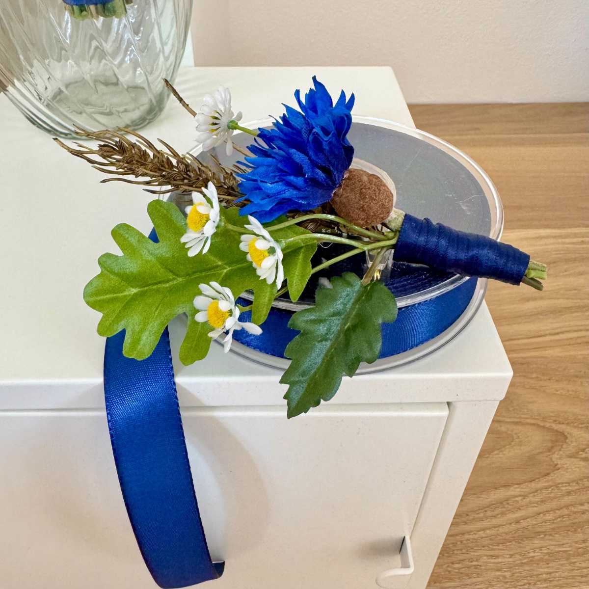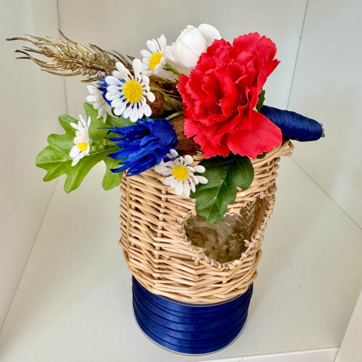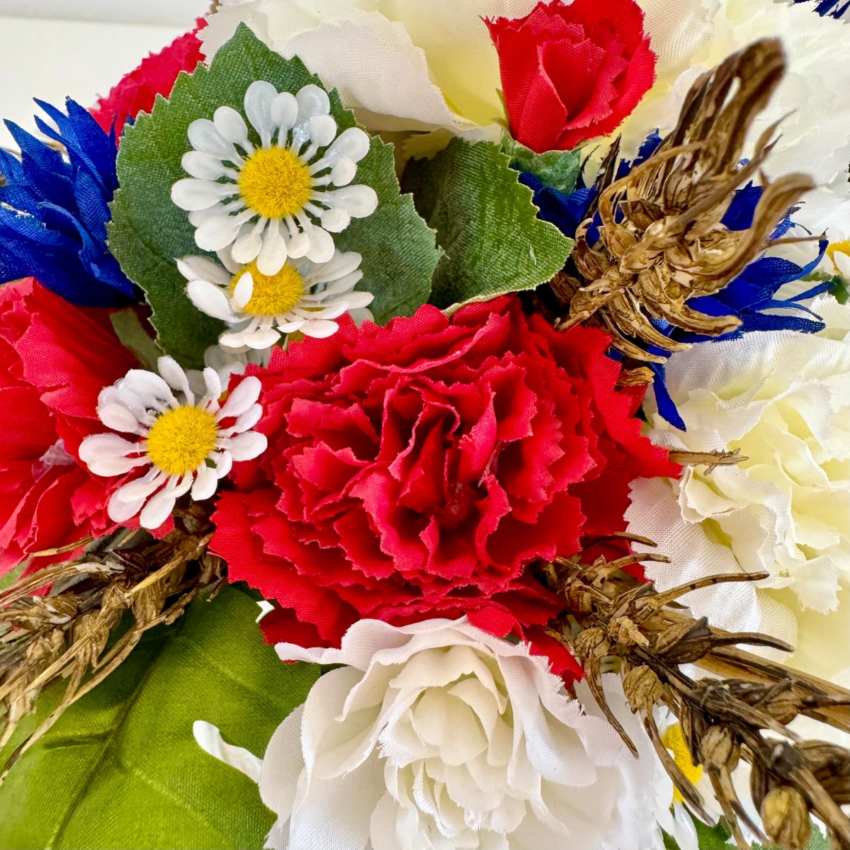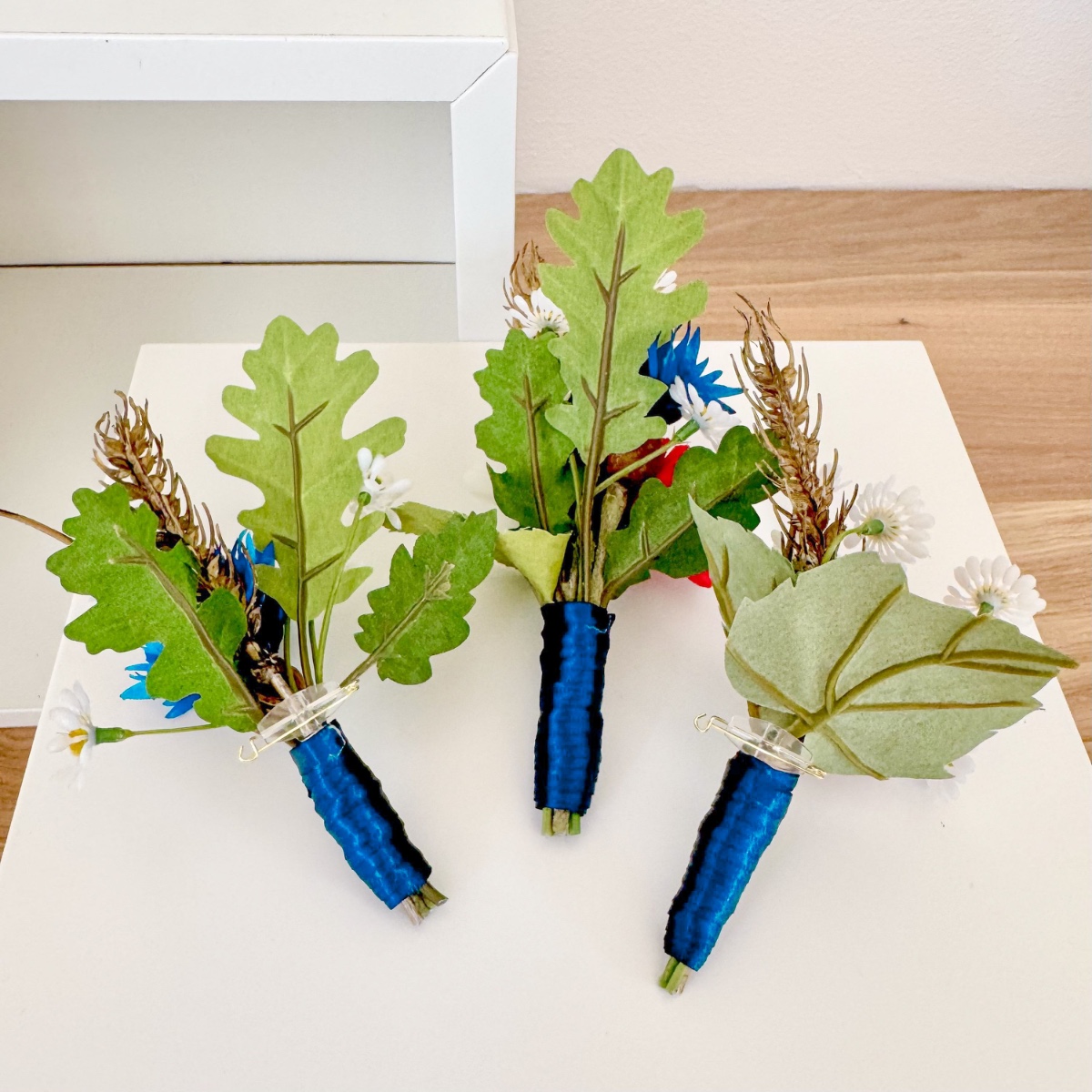 Ein Bund aus Liebe, Stärke und Heimat! Für ihre Hochzeit wünschte sich Tina einen Brautstrauß mit besonderer Symbolkraft. Im Mittelpunkt stehen ausdrucksstarke rote und weiße Nelken sowie blaue Kornblumen als Hauptblumen. Die roten Nelken symbolisieren leidenschaftliche Liebe und Hingabe, während die weißen Nelken für Reinheit, Treue und aufrichtige Verbundenheit stehen. Die Kornblume ergänzt das Arrangement mit ihrer Bedeutung von Natürlichkeit, Hoffnung und Beständigkeit. Zarte Kamille als Füllblume bringt eine sanfte Leichtigkeit in den Strauß und steht traditionell für Ruhe, Bescheidenheit und innere Stärke. Goldene Weizenähren verleihen dem Bouquet nicht nur eine warme, strukturgebende Note, sondern symbolisieren Fruchtbarkeit, Wohlstand und eine gemeinsame Zukunft. Das Grün wird durch Linden- und Eichenblätter geprägt: Lindenblätter stehen für Liebe, Geborgenheit und Gemeinschaft, während Eichenblätter Kraft, Standhaftigkeit und Beständigkeit verkörpern. Gemeinsam schaffen sie eine kraftvolle, naturverbundene Basis. Abgerundet wird der Brautstrauß durch ein dunkelblaues Band, das für Tiefe, Treue und Ruhe steht und dem Gesamtbild eine elegante, klassische Note verleiht. Passend zum Brautstrauß entstanden zudem florale Anstecker für den Bräutigam und die Hochzeitsgesellschaft. Die Ansteckblume des Bräutigams greift die Hauptsymbolik des Brautstraußes auf und verbindet die zentralen Elemente zu einem kompakten, bedeutungsvollen Detail. Für den Trauzeugen steht die Kombination aus Kornblume und Eichenblättern im Fokus – ein Ausdruck von Loyalität, Stärke und verlässlicher Freundschaft, ergänzt durch Kamille und Weizen als verbindende Elemente. Die Ansteckblumen der Brautjungfer betont mit roter Nelke und Lindenblättern die Themen Liebe, Herzlichkeit und Zusammenhalt, ebenfalls ergänzt durch Kamille und Weizen für ein einheitliches Gesamtbild. Der gesamte Look vereint auf elegante Weise Symbolik, Naturverbundenheit und emotionale Tiefe – ein florales Konzept, das die Werte und Wünsche der Kundin sichtbar und spürbar macht. Shop the Look!