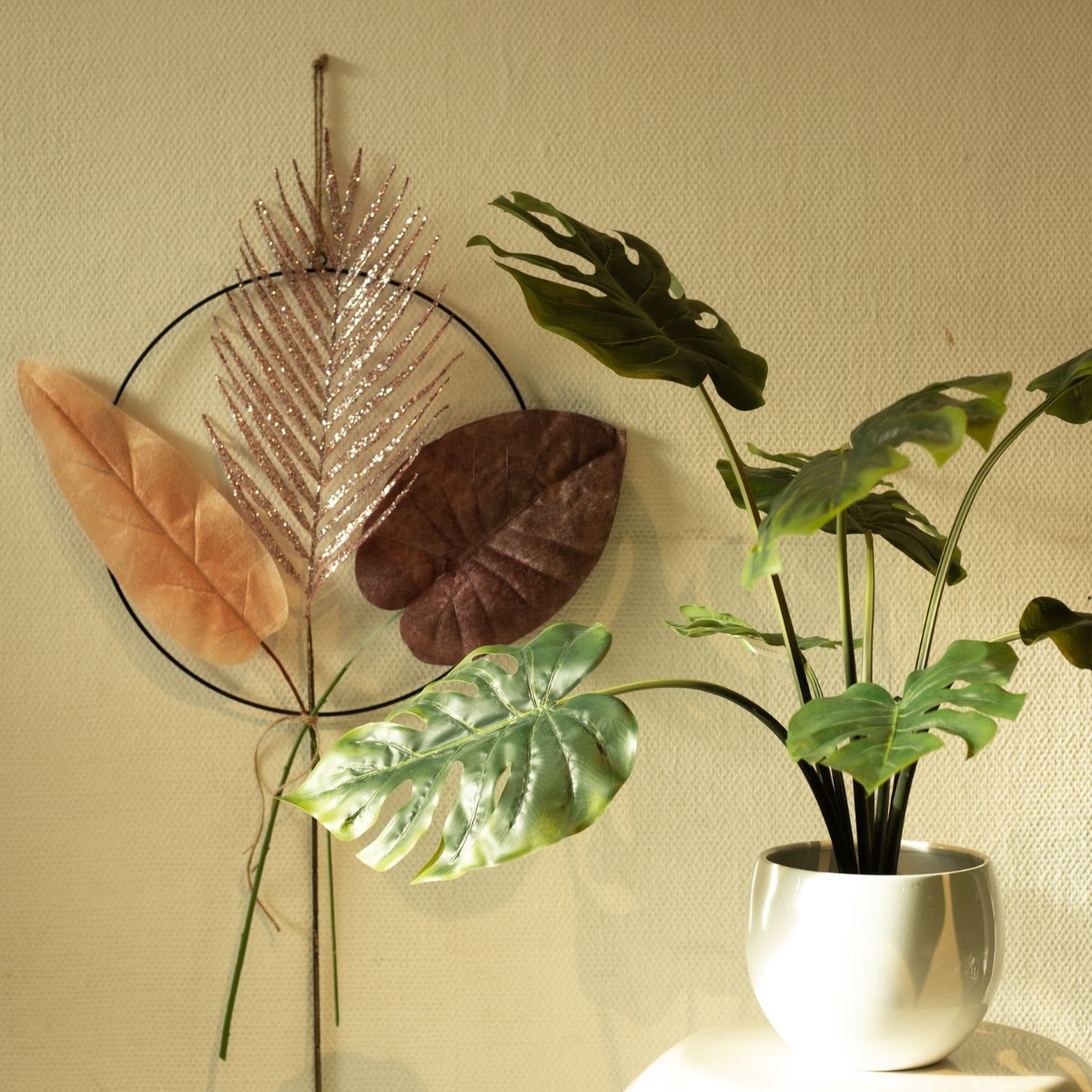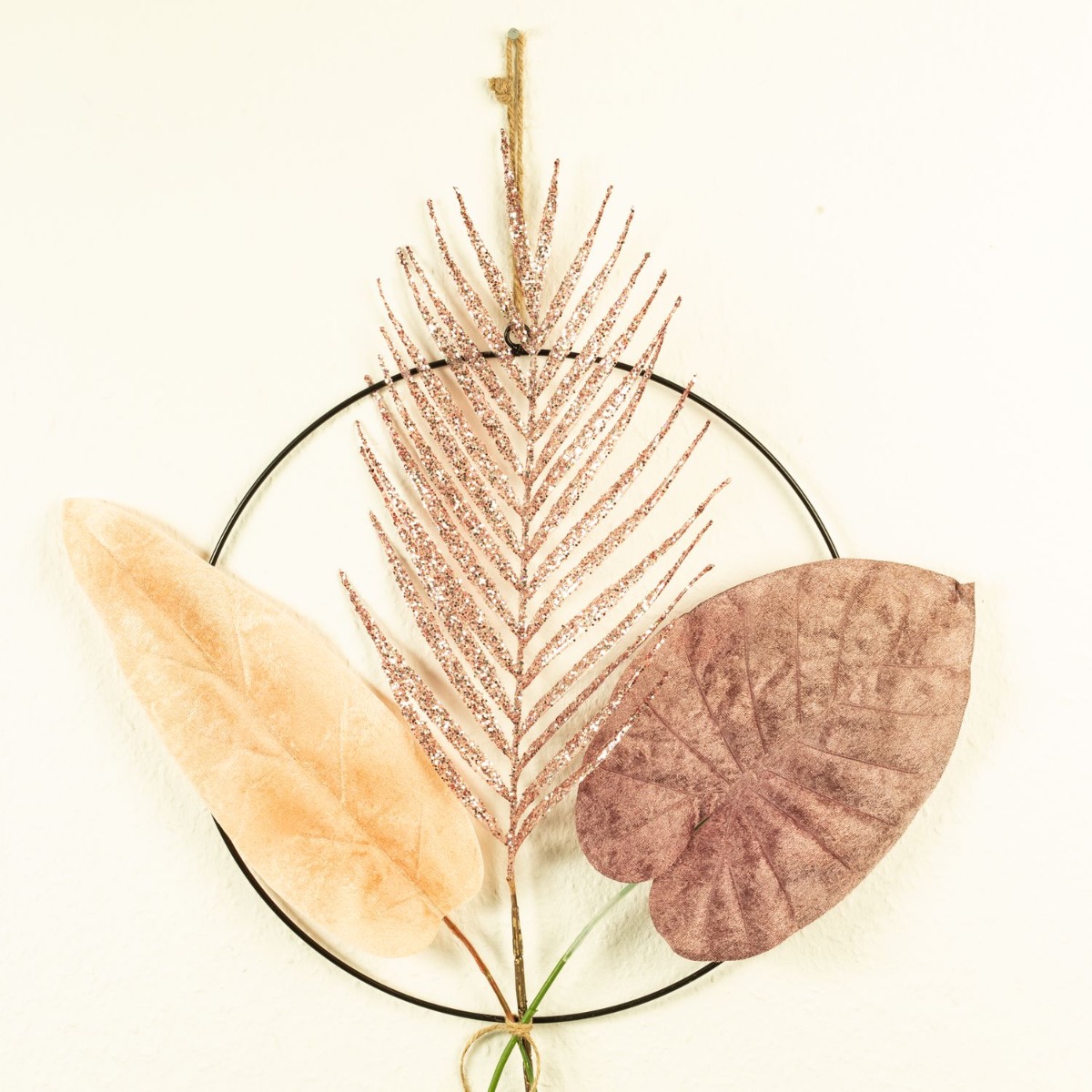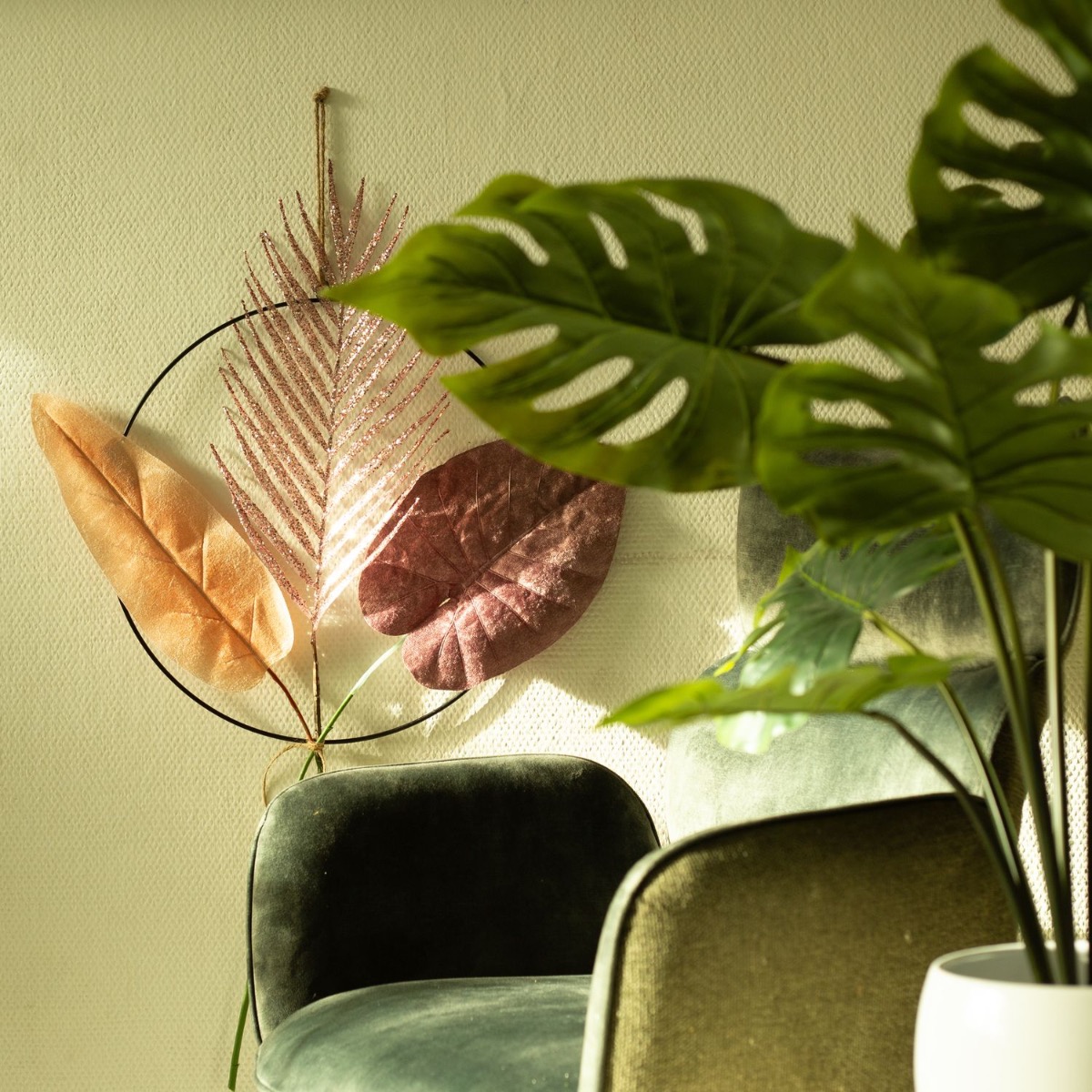 Palmwedel mit Samt und Glitzer! So stellt man sich den Dschungel zwar nicht gerade vor, aber um das wohnliche Gefühl im zuhause zu erhalten passt es wirklich super. Das samtige Bananenblatt in einem zarten Roséton, der rosa glitzernde Palmwedel und das samtige Philodendronblatt in altrosa wurden zu einer Wanddeko auf einem Metallring fixiert. Die Monstera-Topfpflanze in dem bauchigen Übertopf erzeugt einen leichten Dschungeleffekt und bringt noch mehr Gemütlichkeit in den Wohnraum. Shop the Look!