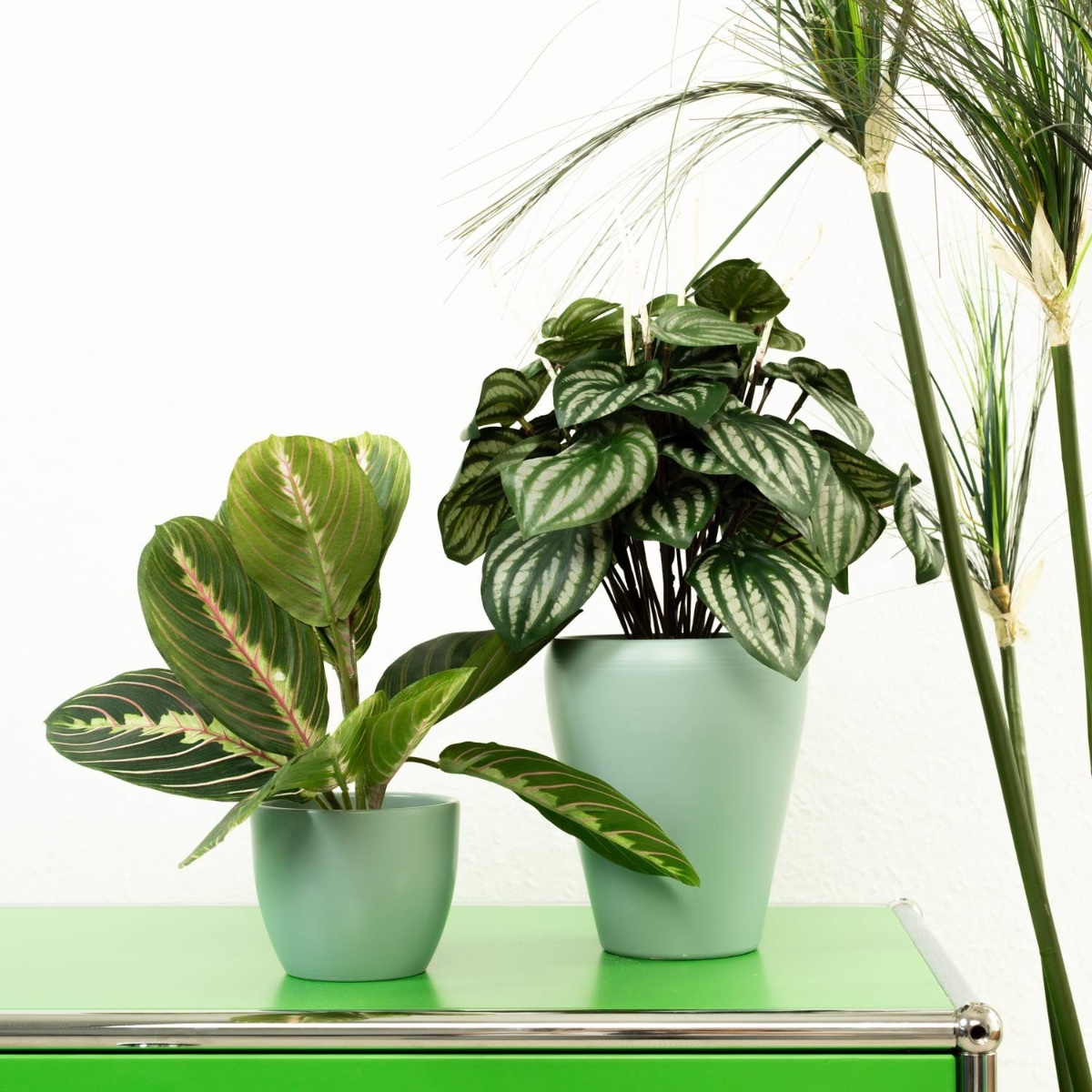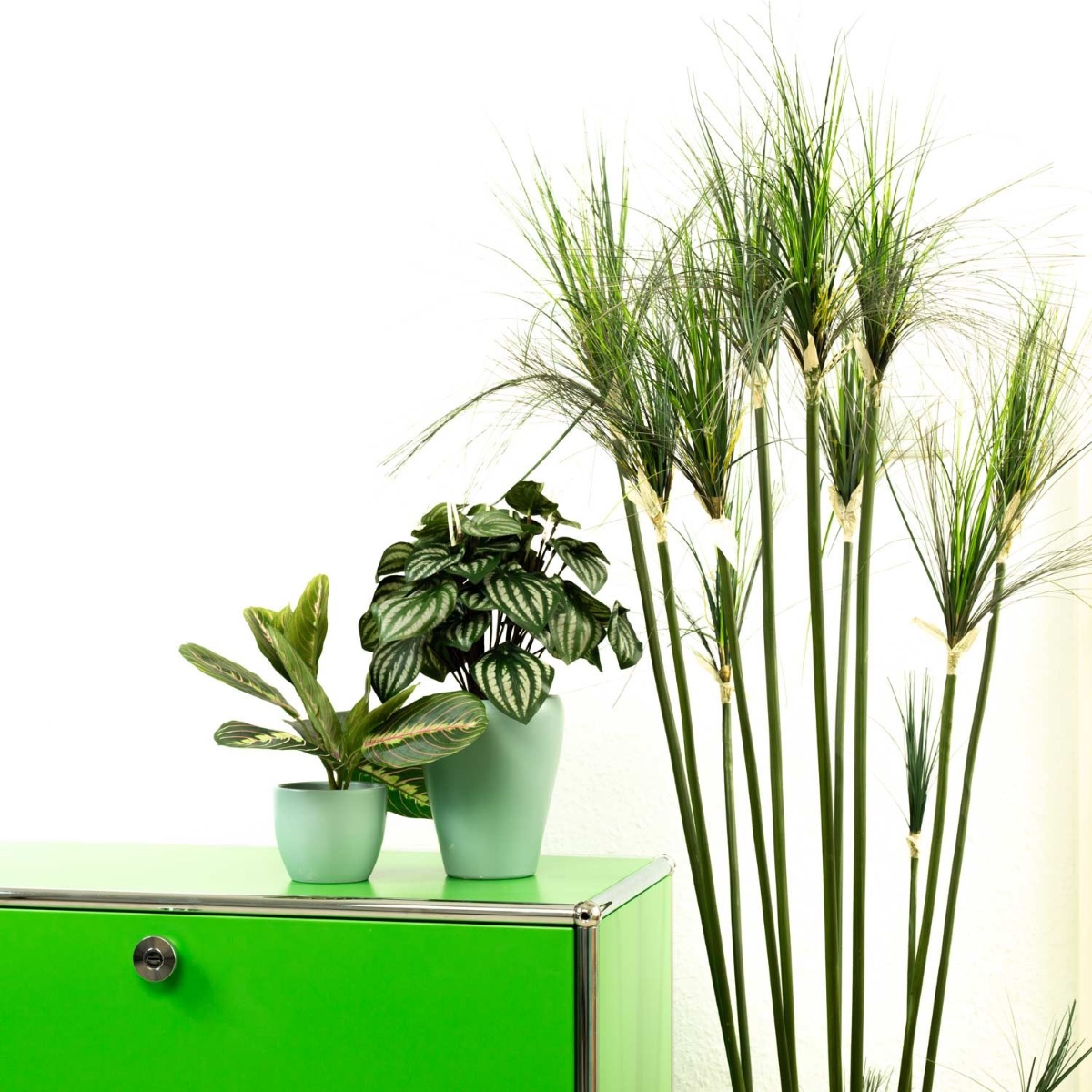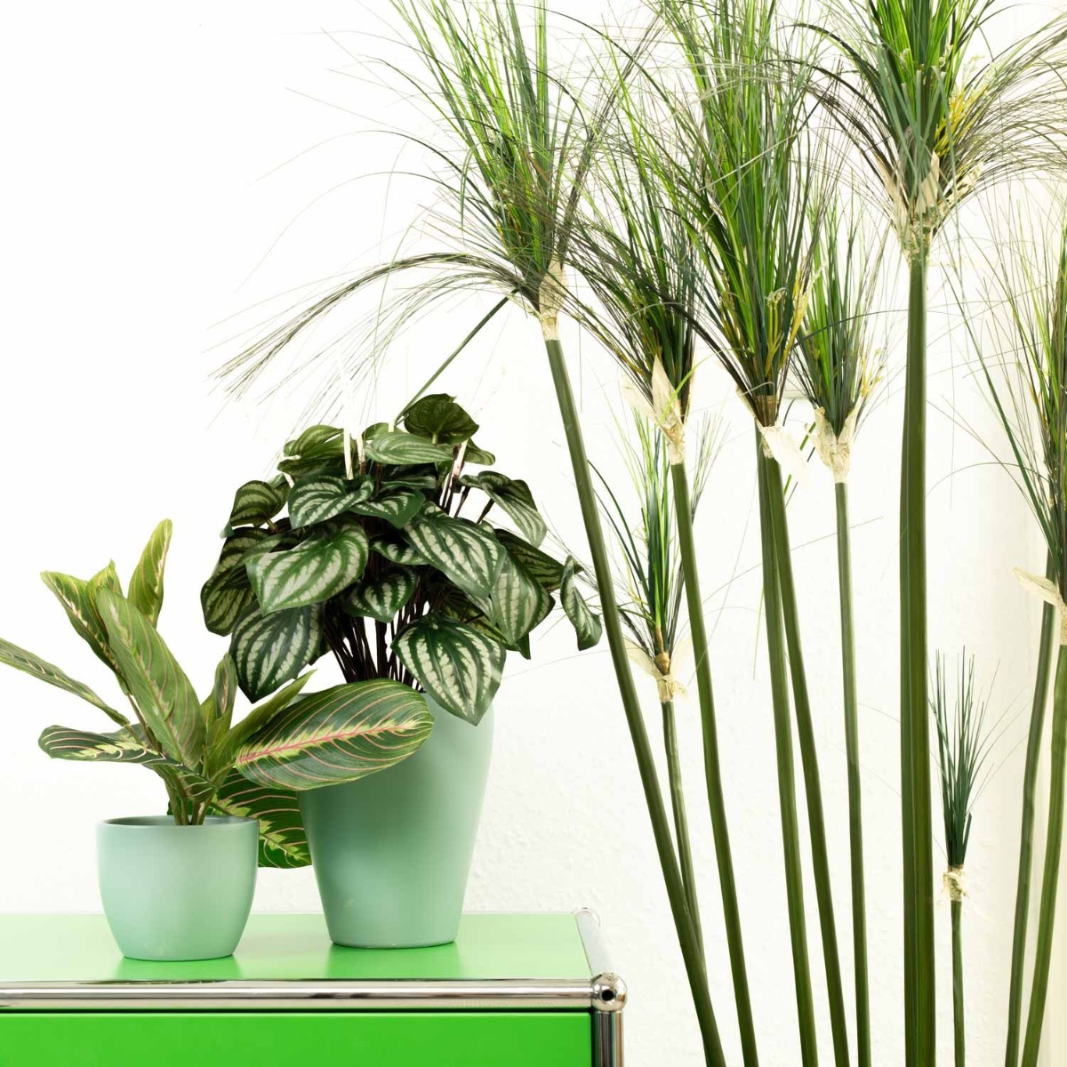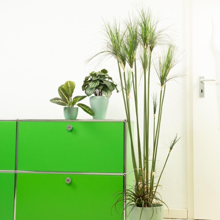 Grün und Mint! Für den Büroalltag sind Grünpflanzen als Deko besonders gut geeignet, denn sie wirken entspannend für die Augen und das Gemüt. Wie praktisch, dass man nicht mal gießen muss, wenn man in seine Arbeit vertieft ist, denn Kunstpflanzen bleiben immer grün und brauchen kaum Pflege. Zwergpfeffer und Pfeilwurz harmonieren perfekt in diesem Look und passen einfach super zu den mintfarbenen Töpfen. So schön kann Arbeit aussehen! Shop the Look!