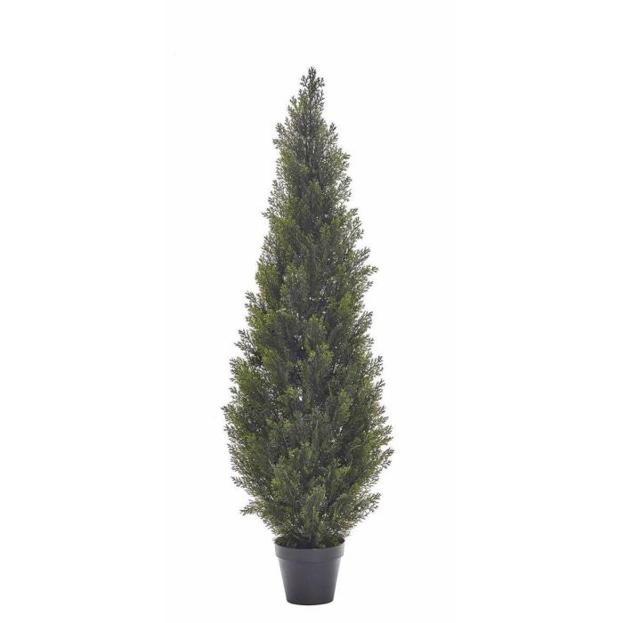 Künstlicher Zeder im schwarzen Kunststoff Topf. Die Kunststoff Konifere hat 125 Nadelzweige und ist 150 cm hoch.
